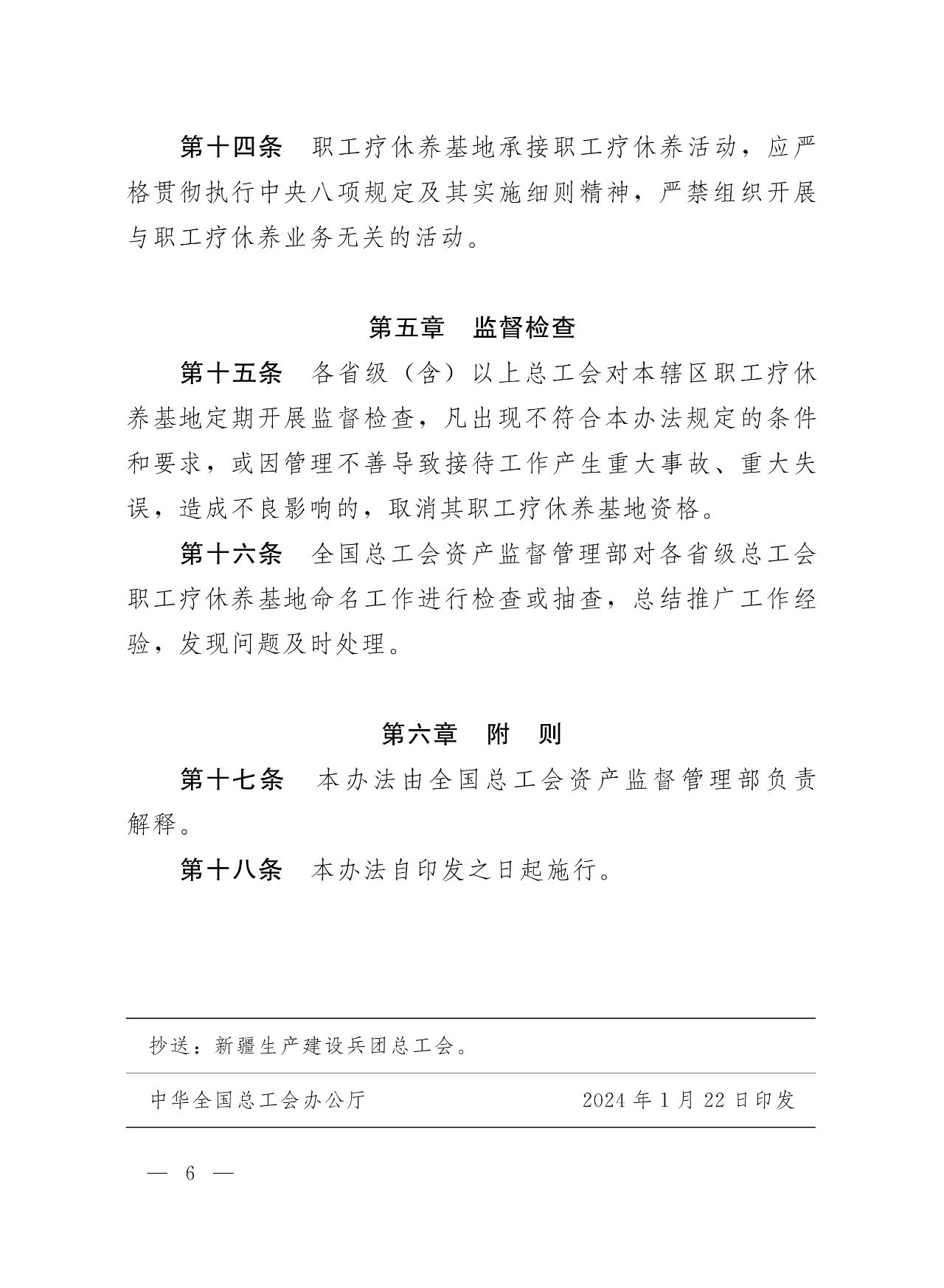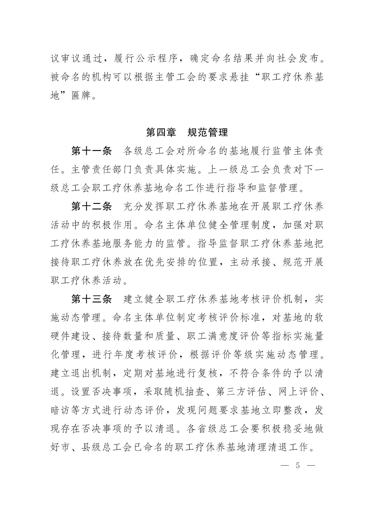 《辦法》要求,各省級(jí)總工會(huì)制定本轄區(qū)基地命名管理制度、工作規(guī)劃,履行制定制度、組織申報(bào)、基層推報(bào)、審核命名等命名程序。各級(jí)總工會(huì)對(duì)所命名的基地履行監(jiān)管主體責(zé)任,健全管理制度,加強(qiáng)指導(dǎo)監(jiān)督,定期監(jiān)督檢查。充分發(fā)揮基地在開(kāi)展職工療休養(yǎng)活動(dòng)中的積極作用。建立考核評(píng)價(jià)機(jī)制、退出機(jī)制,制定考核評(píng)價(jià)標(biāo)準(zhǔn),設(shè)置否決事項(xiàng),實(shí)施動(dòng)態(tài)管理。